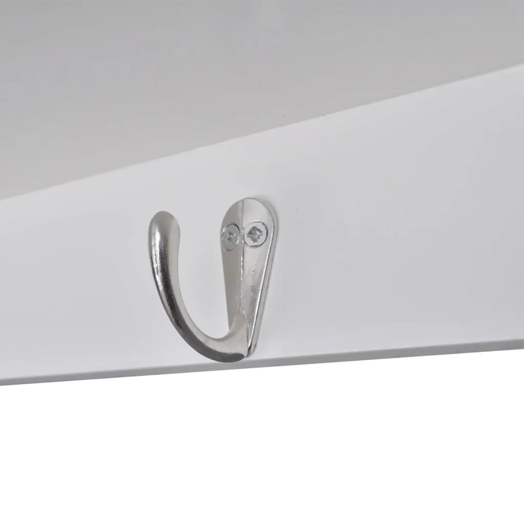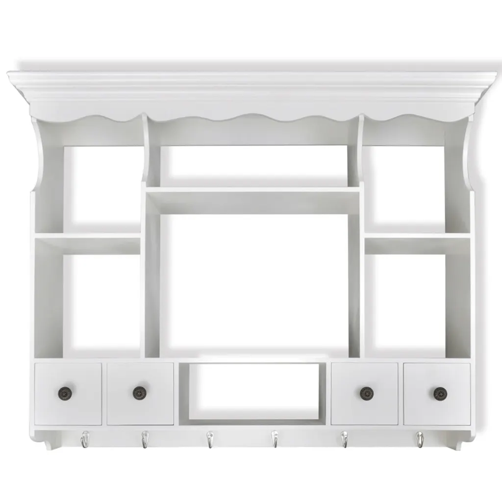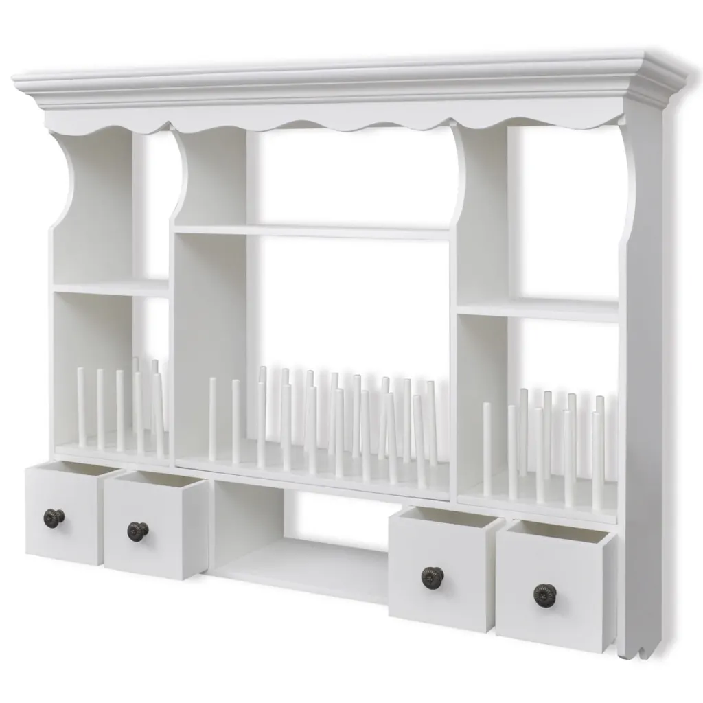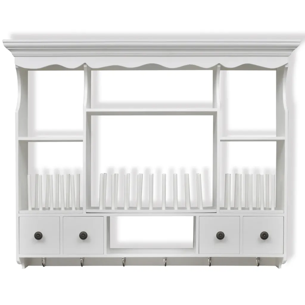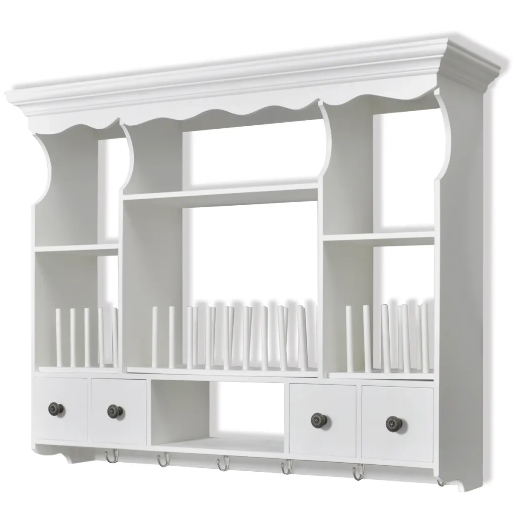 • 1 valge puidust köögi seinakapp nelja sahtli, avatud riiulite, taldrikupulkade ja konksudega