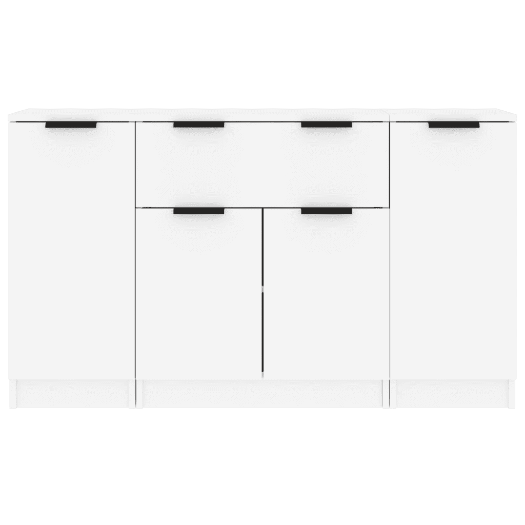Valge tehispuidust puhvetkappide komplekt pakub praktilist hoiuruumi, säilitades samal ajal minimalistliku ja puhta ilme. Kolm eri laiusega kappi loovad ühtse terviku, mis sobib igapäevaste esemete korrastatud hoidmiseks ning täiendab neutraalse tooniga erinevaid koduseid interjööre.