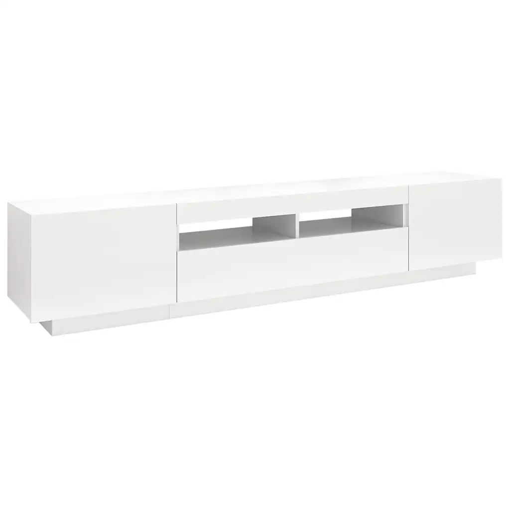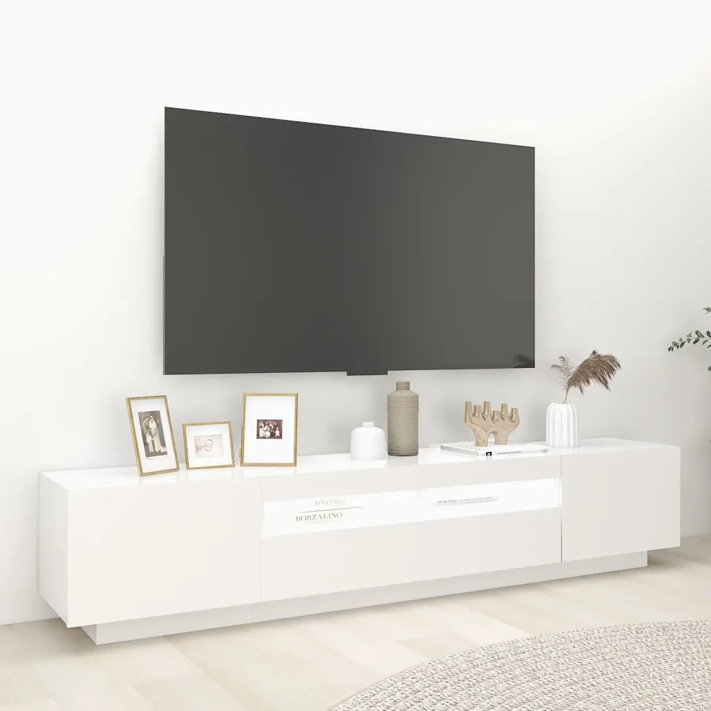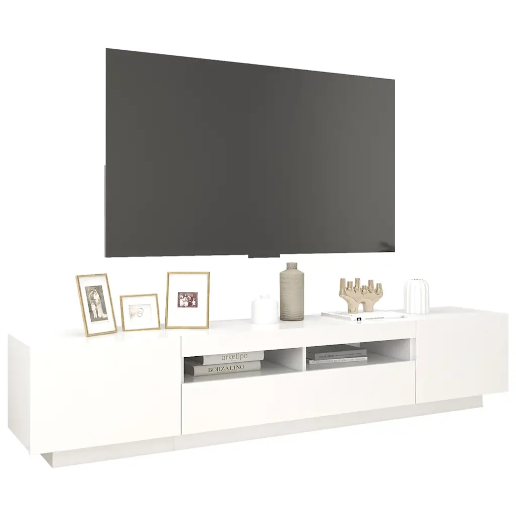 See valge telerialus RGB LED-valgustusega ühendab trendika välimuse ja praktilise hoiuruumi, muutes elutoa visuaalselt ühtseks meedianurgaks. Lai 200 cm pikkune alus mahutab mugavalt teleri ning laseb paigutada DVD-mängija, mängukonsooli ja muud meediaseadmed ühte kohta, luues korrastatud ja ühtse lahenduse.