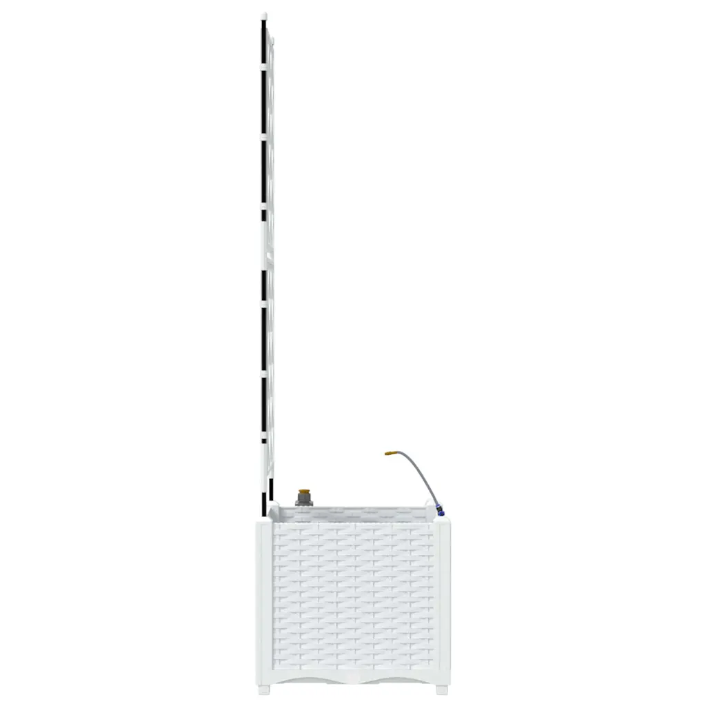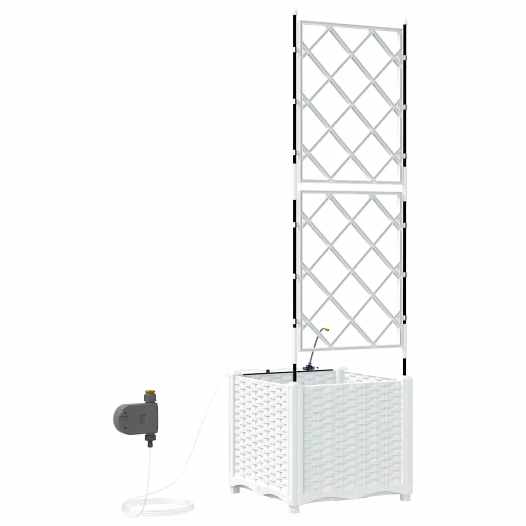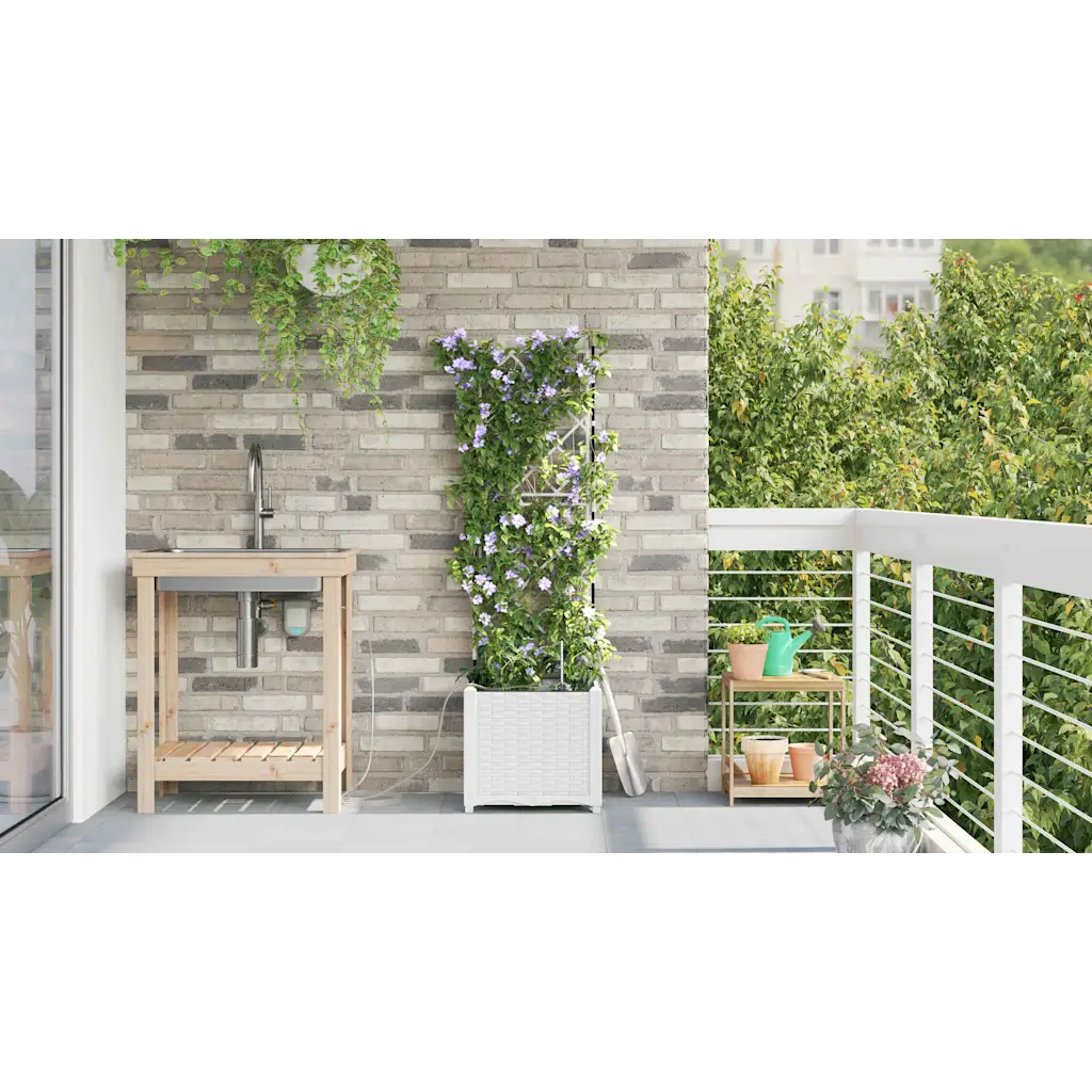 See valge terasest istutuskast trelliseinaga on praktiline lahendus ronitaimede kasvatamiseks aias, terrassil või rõdul. Kaasaegne disain puhaste joontega sobitub erinevate väliruumide stiilidega, lisades neile korrastatud ja rohelise ilme. Tänu sisseehitatud kastmissüsteemile püsib muld kauem niiske, mis on eriti mugav kuivemal ajal või kui oled kodust pikemalt ära.