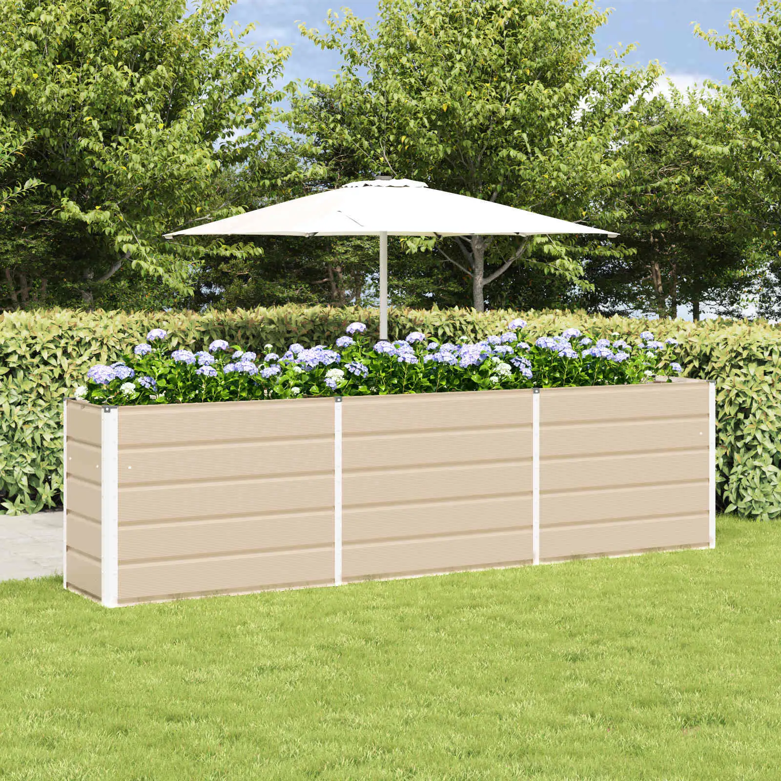 See valge tsinkterasest taimekast loob selge ja puhta istutusala nii aias kui terrassil. Kuumtsingitud teras talub hästi erinevaid ilmastikutingimusi, säilitades oma välimuse pikaks ajaks. Tänu pikale ja madalale vormile sobib taimekast hästi nii ruumi jagamiseks kui dekoratiivse taimeriba loomiseks.
