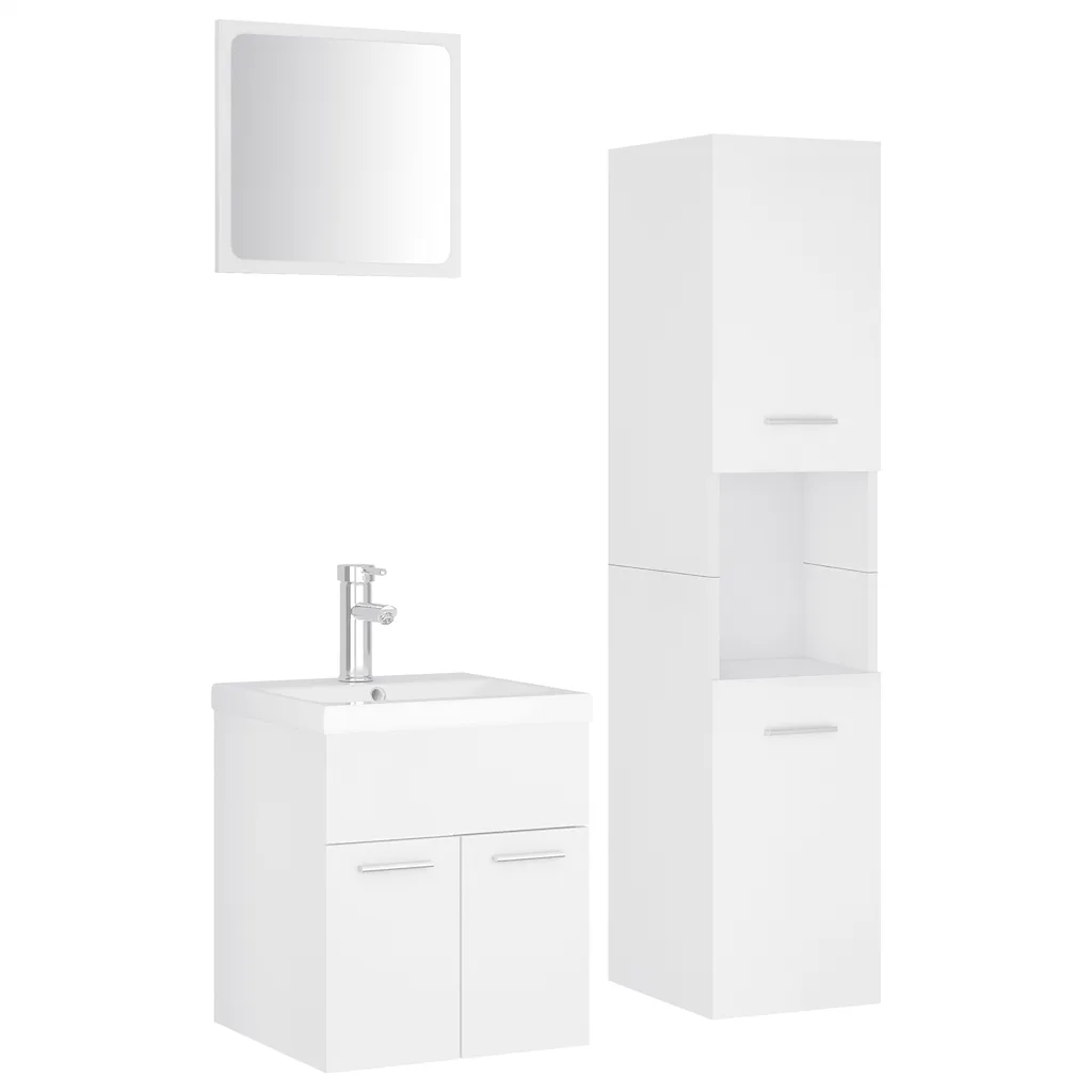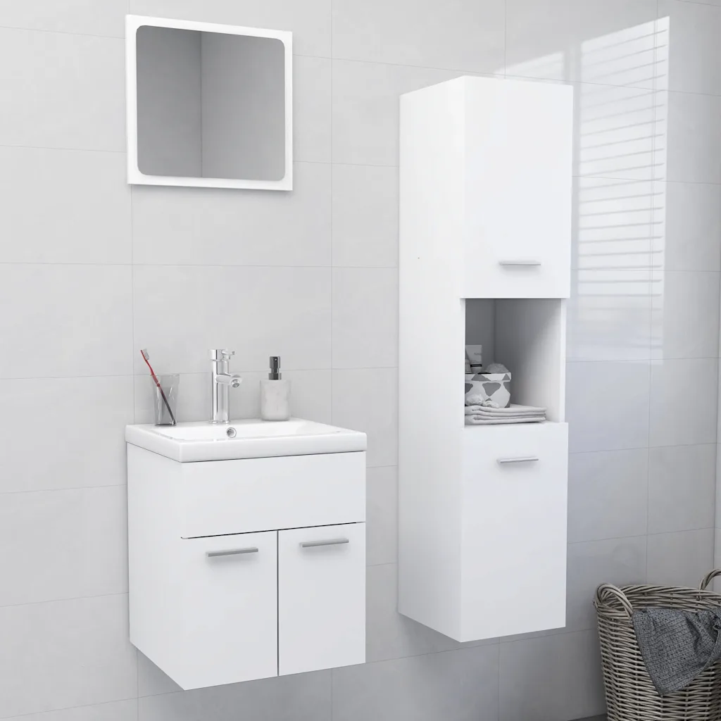 See valge vannitoamööbli komplekt loob vannituppa ühtse ja praktilise lahenduse, pakkudes nii hoiuruumi kui ka funktsionaalset pesemisala. Komplektis on valamukapp, kõrge kapp, peegel ning sisseehitatud keraamiline valamu koos kraani ja ülevoolufunktsiooniga äravoolutoruga, mis sobib hästi nii väiksemasse kui ka suuremasse vannituppa.