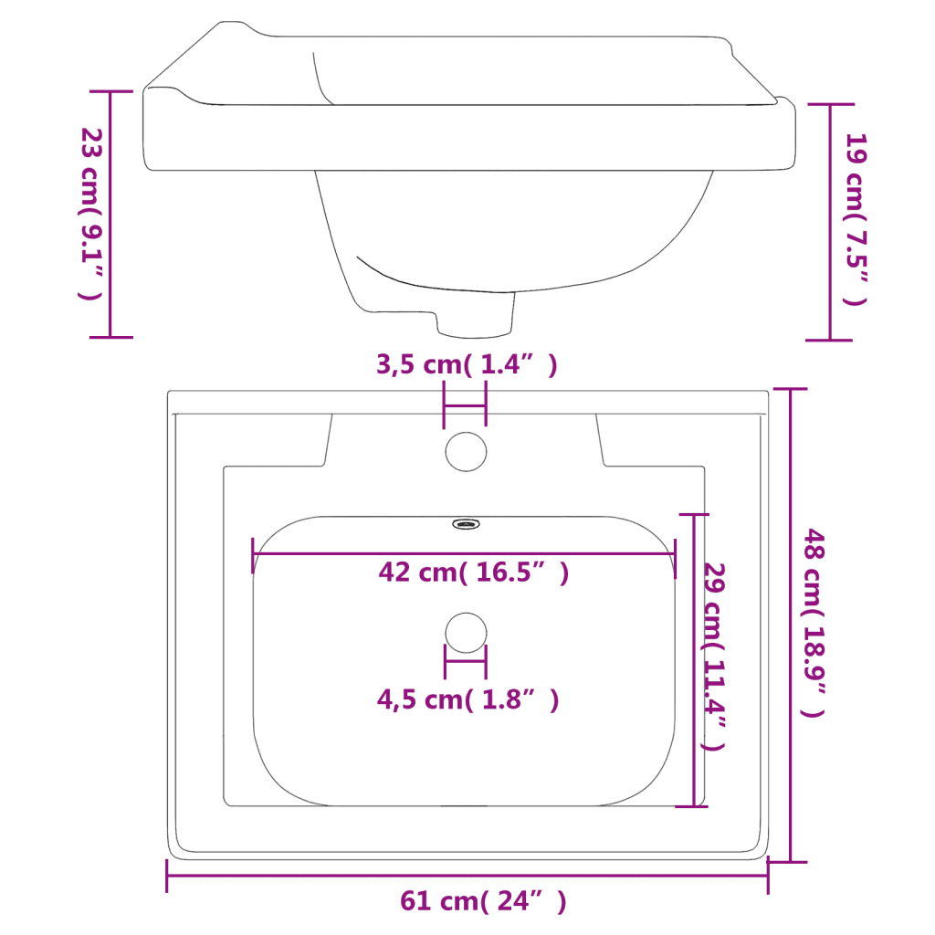 • Praktilised mõõdud – kogumõõtmed 61 x 48 x 23 cm (P x L x K) pakuvad mugavat pesupinda, säästes samas ruumi.