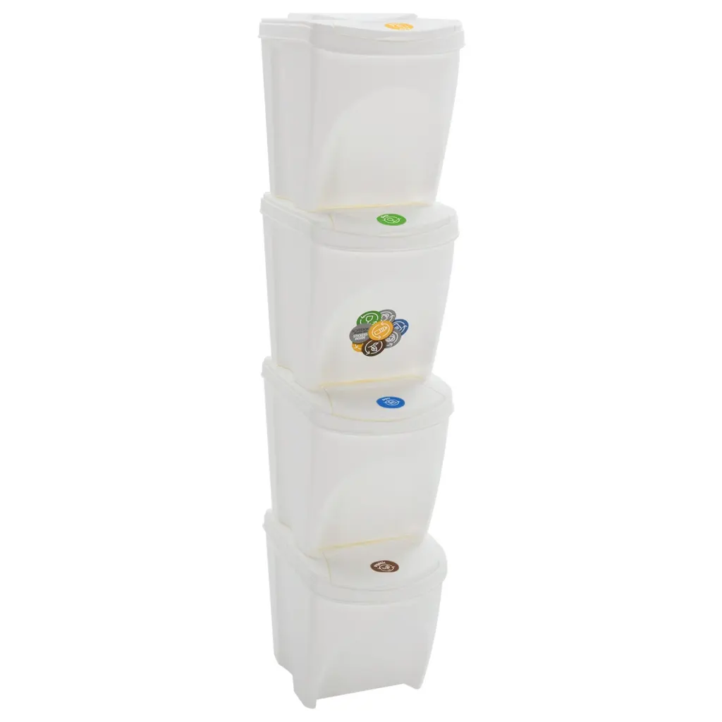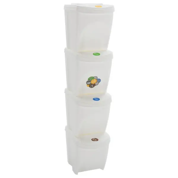 See neljaosaline virnastatavate prügikastide komplekt pakub ruumisäästlikku ja selget lahendust jäätmete sorteerimiseks. Tugev polüpropüleen, eemaldatavad kaaned ja märgistatud kastid muudavad prügi kogumise korrastatumaks ning aitavad hoida kodu või kontori puhtamana.