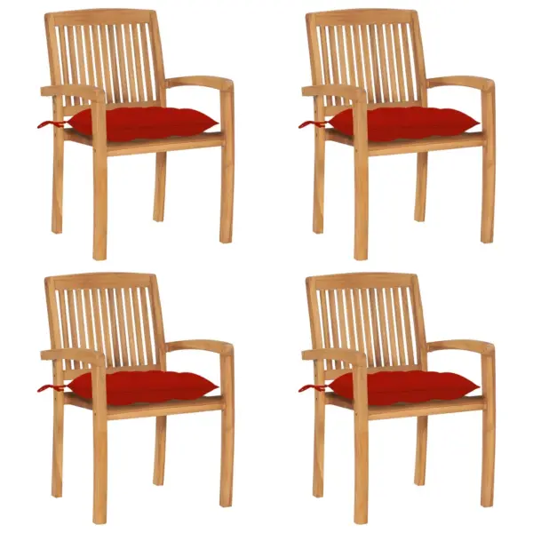See 4-osaline tiigipuust virnastatavate aiatoolide komplekt loob mugava söögiala aeda, terrassile või tuppa. Peenelt lihvitud ja vee baasil viimistletud tiigipuit toob ruumi loodusliku ilme, samal ajal kui punased istmepadjad lisavad pehmust ja värvi. Kui toole ei kasutata, saab need ruumi säästmiseks üksteise peale virnastada.