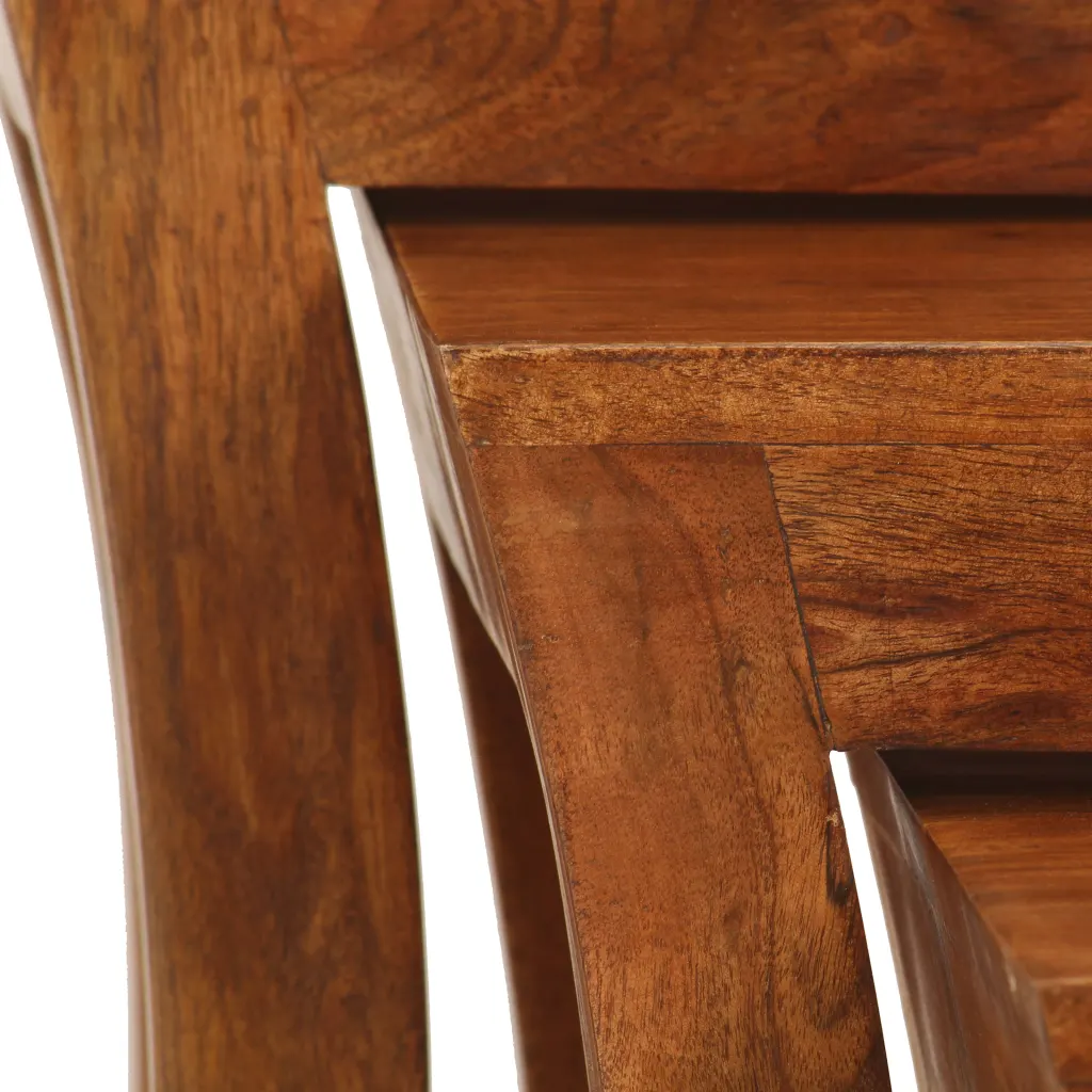See 3-osaline virnastatavate laudade komplekt on valmistatud mee toonis viimistlusega akaatsiapuidust ning on ajatu valik igasse koju. Lauad sobivad kasutamiseks kohvilaua, abilaua, lisalaua või öökapina, pakkudes nii funktsionaalset pinda kui ka hubast looduslikku ilmet. Virnastatav disain aitab laudu mitte kasutades hõlpsalt ruumi kokku hoida.