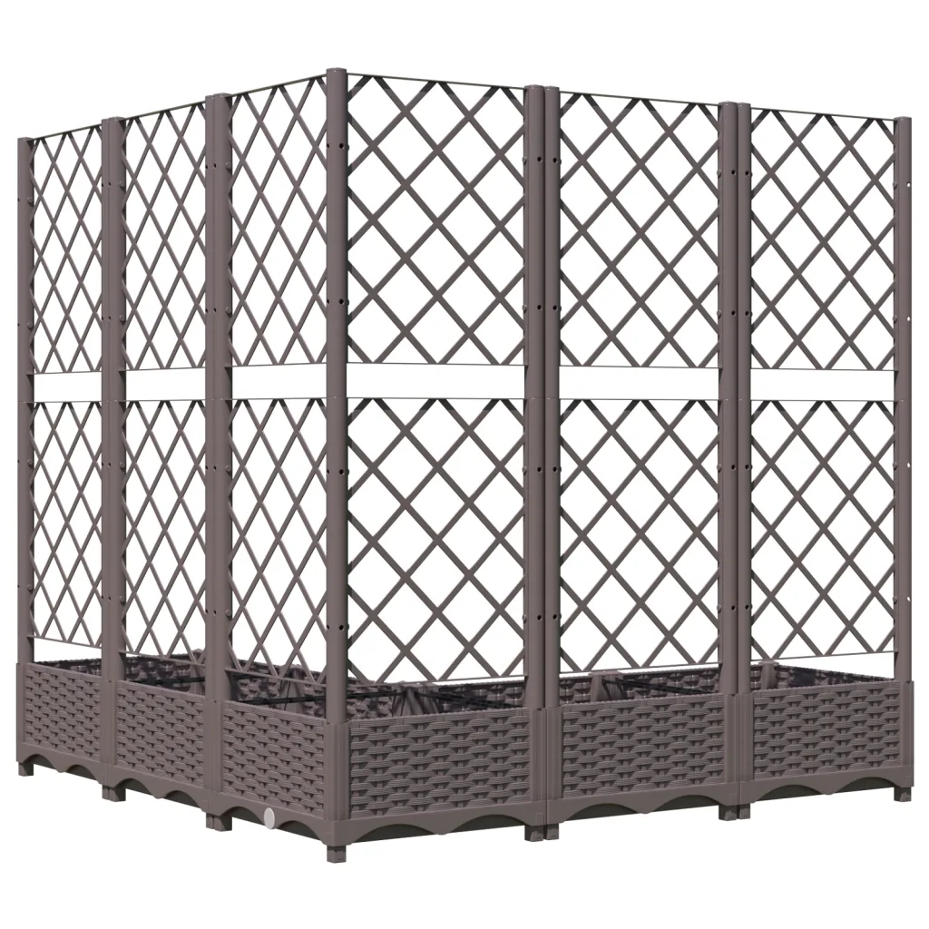 See ilmastikukindlast PP-st valmistatud pruun võrega taimekast sobib sissepääsu, rõdu, terrassi või aia haljastamiseks. Alumine kast pakub rohkelt ruumi erinevatele taimedele ja lilledele, samal ajal kui integreeritud võre toetab ronitaimi ning aitab kujundada dekoratiivse rohelise seina.