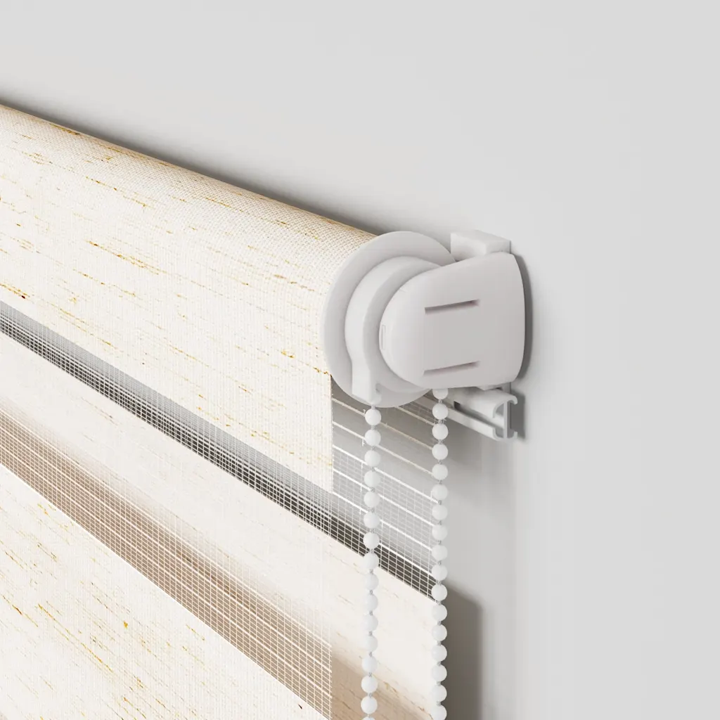 - Kahekihiline triibuline zebra-kangas koos vahelduvate läbipaistvate ja läbipaistmatute ribadega võimaldab reguleerida valgust alates poolläbipaistvast kuni peaaegu pimendava tasemeni.