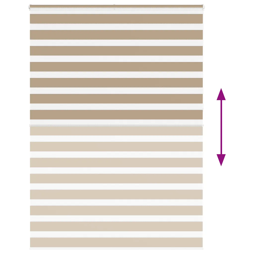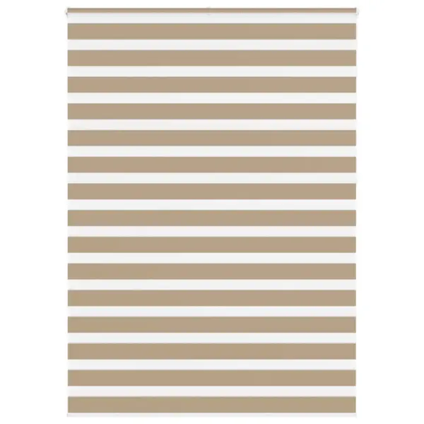 See liivapruun zebra ruloo mõõdus 165 x 230 cm pakub paindlikku lahendust ruumi valguse ja privaatsuse reguleerimiseks. Kahekihiline, vaheldumisi läbipaistvate ja läbipaistmatute ribadega polüesterkangas võimaldab muuta valguse hulka sujuvalt poolläbipaistvast kuni peaaegu täieliku pimenemiseni.